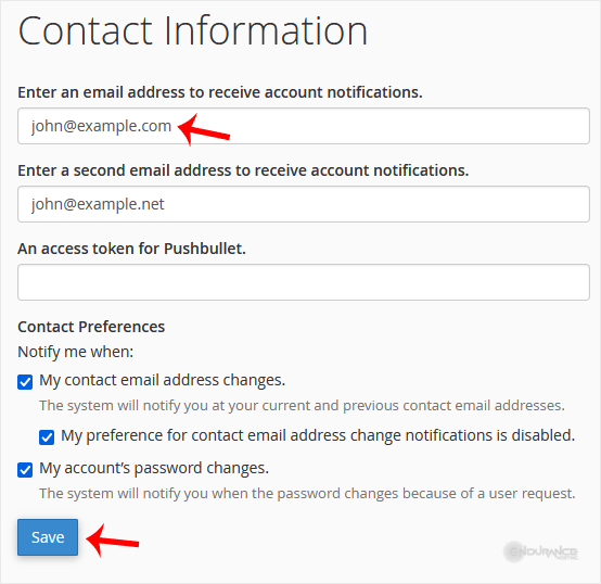 3. You should see an input box below the line that says, Enter an email address to receive account notifications and password reset confirmations. Update your existing email address or add your secondary email address in the second email input box.