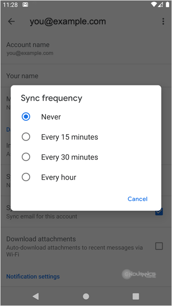 5. Set your frequency to 15 minutes or any other custom time. If you do not wish to sync email automatically, set it to Never. Sync will have to be done manually after setting it to Never.